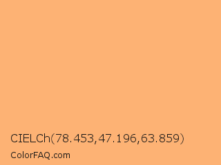 CIELCh 78.453,47.196,63.859 Color is a light orange color and the nearest color is Very Light Tangelo #ffb077. Hex code #fdb274 and RGB value is rgb(253,178,116). In RGB color space, this color is composed of 99% red, 70% green, 45% blue, In CMYK color space, this color is composed of 0% cyan, 30% magenta, 54% yellow , 1% black , In HSL color space, this color has a hue angle of 27° , 97% saturation and 72% lightness.