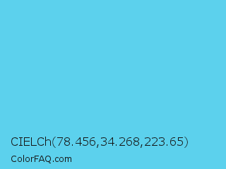 CIELCh 78.456,34.268,223.65 Color is a light cyan color and the nearest color is Turquoise Blue #6cdae7. Hex code #5cd1ed and RGB value is rgb(92,209,237). In RGB color space, this color is composed of 36% red, 82% green, 93% blue, In CMYK color space, this color is composed of 61% cyan, 12% magenta, 0% yellow , 7% black , In HSL color space, this color has a hue angle of 192° , 80% saturation and 65% lightness.