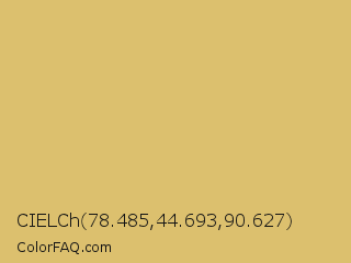 CIELCh 78.485,44.693,90.627 Color is a light orange color and the nearest color is Apache #dfbe6f. Hex code #dcc06e and RGB value is rgb(220,192,110). In RGB color space, this color is composed of 86% red, 75% green, 43% blue, In CMYK color space, this color is composed of 0% cyan, 13% magenta, 50% yellow , 14% black , In HSL color space, this color has a hue angle of 45° , 61% saturation and 65% lightness.
