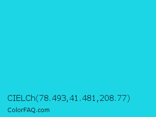 CIELCh 78.493,41.481,208.77 Color is a normal cyan color and the nearest color is Bright Turquoise #08e8de. Hex code #1cd6e6 and RGB value is rgb(28,214,230). In RGB color space, this color is composed of 11% red, 84% green, 90% blue, In CMYK color space, this color is composed of 88% cyan, 7% magenta, 0% yellow , 10% black , In HSL color space, this color has a hue angle of 185° , 80% saturation and 51% lightness.