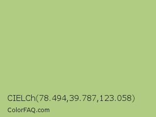 CIELCh 78.494,39.787,123.058 Color is a light green color and the nearest color is Swamp Green #acb78e. Hex code #b0cc83 and RGB value is rgb(176,204,131). In RGB color space, this color is composed of 69% red, 80% green, 51% blue, In CMYK color space, this color is composed of 14% cyan, 0% magenta, 36% yellow , 20% black , In HSL color space, this color has a hue angle of 83° , 42% saturation and 66% lightness.