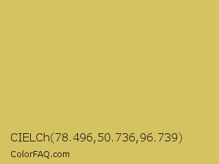 CIELCh 78.496,50.736,96.739 Color is a light yellow color and the nearest color is Tacha #d6c562. Hex code #d5c362 and RGB value is rgb(213,195,98). In RGB color space, this color is composed of 84% red, 76% green, 38% blue, In CMYK color space, this color is composed of 0% cyan, 8% magenta, 54% yellow , 16% black , In HSL color space, this color has a hue angle of 51° , 58% saturation and 61% lightness.