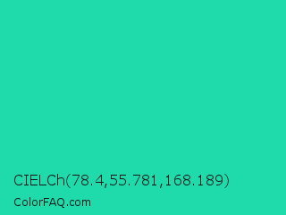 CIELCh 78.4,55.781,168.189 Color is a normal cyan color and the nearest color is Shamrock #33cc99. Hex code #1fdbab and RGB value is rgb(31,219,171). In RGB color space, this color is composed of 12% red, 86% green, 67% blue, In CMYK color space, this color is composed of 86% cyan, 0% magenta, 22% yellow , 14% black , In HSL color space, this color has a hue angle of 165° , 75% saturation and 49% lightness.