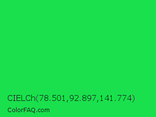 CIELCh 78.501,92.897,141.774 Color is a normal green color and the nearest color is Malachite #0bda51. Hex code #1ae04d and RGB value is rgb(26,224,77). In RGB color space, this color is composed of 10% red, 88% green, 30% blue, In CMYK color space, this color is composed of 88% cyan, 0% magenta, 66% yellow , 12% black , In HSL color space, this color has a hue angle of 135° , 79% saturation and 49% lightness.