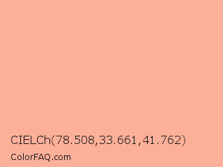 CIELCh 78.508,33.661,41.762 Color is a light red color and the nearest color is Rose Bud #fbb2a3. Hex code #fcb09a and RGB value is rgb(252,176,154). In RGB color space, this color is composed of 99% red, 69% green, 60% blue, In CMYK color space, this color is composed of 0% cyan, 30% magenta, 39% yellow , 1% black , In HSL color space, this color has a hue angle of 13° , 94% saturation and 80% lightness.