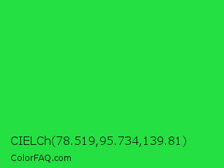CIELCh 78.519,95.734,139.81 Color is a normal green color and the nearest color is Lime Green #32cd32. Hex code #25e042 and RGB value is rgb(37,224,66). In RGB color space, this color is composed of 15% red, 88% green, 26% blue, In CMYK color space, this color is composed of 83% cyan, 0% magenta, 71% yellow , 12% black , In HSL color space, this color has a hue angle of 129° , 75% saturation and 51% lightness.
