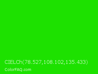CIELCh 78.527,108.102,135.433 Color is a normal green color and the nearest color is Green #00ff00. Hex code #1de100 and RGB value is rgb(29,225,0). In RGB color space, this color is composed of 11% red, 88% green, 0% blue, In CMYK color space, this color is composed of 87% cyan, 0% magenta, 100% yellow , 12% black , In HSL color space, this color has a hue angle of 112° , 100% saturation and 44% lightness.