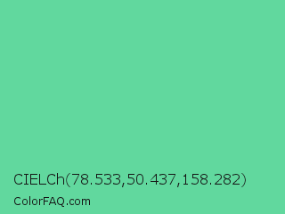 CIELCh 78.533,50.437,158.282 Color is a light green color and the nearest color is Medium Aquamarine #66ddaa. Hex code #61d89e and RGB value is rgb(97,216,158). In RGB color space, this color is composed of 38% red, 85% green, 62% blue, In CMYK color space, this color is composed of 55% cyan, 0% magenta, 27% yellow , 15% black , In HSL color space, this color has a hue angle of 151° , 60% saturation and 61% lightness.