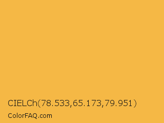 CIELCh 78.533,65.173,79.951 Color is a light orange color and the nearest color is Maximum Yellow Red #f2ba49. Hex code #f5b845 and RGB value is rgb(245,184,69). In RGB color space, this color is composed of 96% red, 72% green, 27% blue, In CMYK color space, this color is composed of 0% cyan, 25% magenta, 72% yellow , 4% black , In HSL color space, this color has a hue angle of 39° , 90% saturation and 62% lightness.