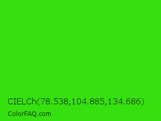 CIELCh 78.538,104.885,134.686 Color is a normal green color and the nearest color is Harlequin Green #46cb18. Hex code #36e00f and RGB value is rgb(54,224,15). In RGB color space, this color is composed of 21% red, 88% green, 6% blue, In CMYK color space, this color is composed of 76% cyan, 0% magenta, 93% yellow , 12% black , In HSL color space, this color has a hue angle of 109° , 87% saturation and 47% lightness.
