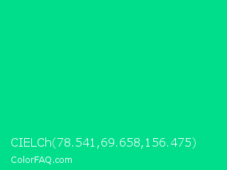CIELCh 78.541,69.658,156.475 Color is a normal green color and the nearest color is Caribbean Green #00cc99. Hex code #00de8c and RGB value is rgb(0,222,140). In RGB color space, this color is composed of 0% red, 87% green, 55% blue, In CMYK color space, this color is composed of 100% cyan, 0% magenta, 37% yellow , 13% black , In HSL color space, this color has a hue angle of 158° , 100% saturation and 44% lightness.