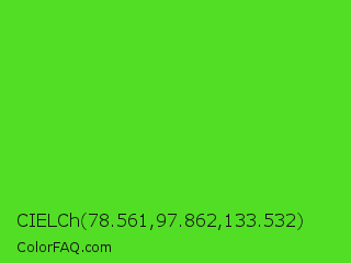 CIELCh 78.561,97.862,133.532 Color is a normal green color and the nearest color is Harlequin Green #46cb18. Hex code #52de25 and RGB value is rgb(82,222,37). In RGB color space, this color is composed of 32% red, 87% green, 15% blue, In CMYK color space, this color is composed of 63% cyan, 0% magenta, 83% yellow , 13% black , In HSL color space, this color has a hue angle of 105° , 74% saturation and 51% lightness.