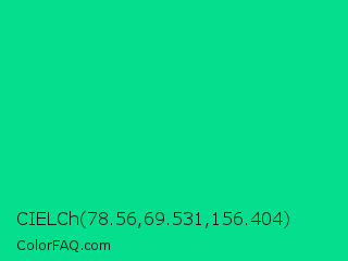 CIELCh 78.56,69.531,156.404 Color is a normal green color and the nearest color is Caribbean Green #00cc99. Hex code #05de8c and RGB value is rgb(5,222,140). In RGB color space, this color is composed of 2% red, 87% green, 55% blue, In CMYK color space, this color is composed of 98% cyan, 0% magenta, 37% yellow , 13% black , In HSL color space, this color has a hue angle of 157° , 96% saturation and 45% lightness.