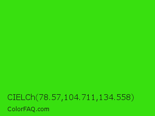 CIELCh 78.57,104.711,134.558 Color is a normal green color and the nearest color is Harlequin Green #46cb18. Hex code #38e00f and RGB value is rgb(56,224,15). In RGB color space, this color is composed of 22% red, 88% green, 6% blue, In CMYK color space, this color is composed of 75% cyan, 0% magenta, 93% yellow , 12% black , In HSL color space, this color has a hue angle of 108° , 87% saturation and 47% lightness.