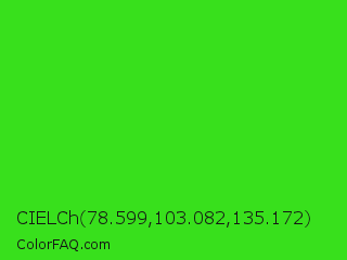 CIELCh 78.599,103.082,135.172 Color is a normal green color and the nearest color is Harlequin Green #46cb18. Hex code #38e01c and RGB value is rgb(56,224,28). In RGB color space, this color is composed of 22% red, 88% green, 11% blue, In CMYK color space, this color is composed of 75% cyan, 0% magenta, 88% yellow , 12% black , In HSL color space, this color has a hue angle of 111° , 78% saturation and 49% lightness.