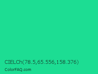 CIELCh 78.5,65.556,158.376 Color is a normal green color and the nearest color is Shamrock #33cc99. Hex code #1cdd93 and RGB value is rgb(28,221,147). In RGB color space, this color is composed of 11% red, 87% green, 58% blue, In CMYK color space, this color is composed of 87% cyan, 0% magenta, 33% yellow , 13% black , In HSL color space, this color has a hue angle of 157° , 78% saturation and 49% lightness.
