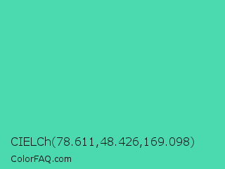 CIELCh 78.611,48.426,169.098 Color is a normal green color and the nearest color is Eucalyptus #44d7a8. Hex code #4bd9b0 and RGB value is rgb(75,217,176). In RGB color space, this color is composed of 29% red, 85% green, 69% blue, In CMYK color space, this color is composed of 65% cyan, 0% magenta, 19% yellow , 15% black , In HSL color space, this color has a hue angle of 163° , 65% saturation and 57% lightness.