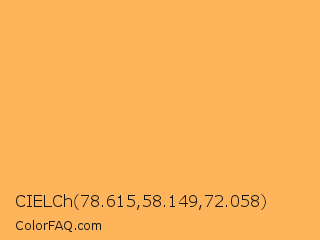 CIELCh 78.615,58.149,72.058 Color is a light orange color and the nearest color is Texas Rose #ffb555. Hex code #fdb45a and RGB value is rgb(253,180,90). In RGB color space, this color is composed of 99% red, 71% green, 35% blue, In CMYK color space, this color is composed of 0% cyan, 29% magenta, 64% yellow , 1% black , In HSL color space, this color has a hue angle of 33° , 98% saturation and 67% lightness.