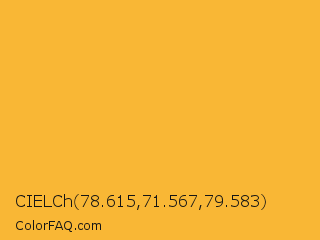 CIELCh 78.615,71.567,79.583 Color is a normal orange color and the nearest color is Saffron #f4c430. Hex code #f9b735 and RGB value is rgb(249,183,53). In RGB color space, this color is composed of 98% red, 72% green, 21% blue, In CMYK color space, this color is composed of 0% cyan, 27% magenta, 79% yellow , 2% black , In HSL color space, this color has a hue angle of 40° , 94% saturation and 59% lightness.