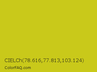 CIELCh 78.616,77.813,103.124 Color is a normal yellow color and the nearest color is Key Lime Pie #bfc921. Hex code #c9c91a and RGB value is rgb(201,201,26). In RGB color space, this color is composed of 79% red, 79% green, 10% blue, In CMYK color space, this color is composed of 0% cyan, 0% magenta, 87% yellow , 21% black , In HSL color space, this color has a hue angle of 60° , 77% saturation and 45% lightness.