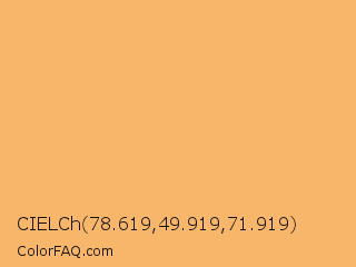 CIELCh 78.619,49.919,71.919 Color is a light orange color and the nearest color is Rajah #f7b668. Hex code #f7b66a and RGB value is rgb(247,182,106). In RGB color space, this color is composed of 97% red, 71% green, 42% blue, In CMYK color space, this color is composed of 0% cyan, 26% magenta, 57% yellow , 3% black , In HSL color space, this color has a hue angle of 32° , 90% saturation and 69% lightness.