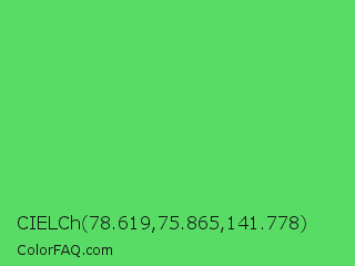 CIELCh 78.619,75.865,141.778 Color is a light green color and the nearest color is Emerald #50c878. Hex code #59dc66 and RGB value is rgb(89,220,102). In RGB color space, this color is composed of 35% red, 86% green, 40% blue, In CMYK color space, this color is composed of 60% cyan, 0% magenta, 54% yellow , 14% black , In HSL color space, this color has a hue angle of 126° , 65% saturation and 61% lightness.