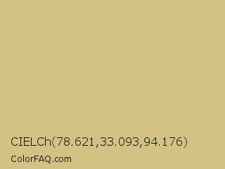 CIELCh 78.621,33.093,94.176 Color is a light yellow color and the nearest color is Straw #d4bf8d. Hex code #d4c285 and RGB value is rgb(212,194,133). In RGB color space, this color is composed of 83% red, 76% green, 52% blue, In CMYK color space, this color is composed of 0% cyan, 8% magenta, 37% yellow , 17% black , In HSL color space, this color has a hue angle of 46° , 48% saturation and 68% lightness.