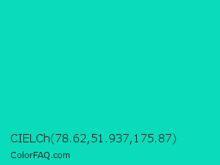 CIELCh 78.62,51.937,175.87 Color is a normal cyan color and the nearest color is Robins Egg Blue #00cccc. Hex code #0adbba and RGB value is rgb(10,219,186). In RGB color space, this color is composed of 4% red, 86% green, 73% blue, In CMYK color space, this color is composed of 95% cyan, 0% magenta, 15% yellow , 14% black , In HSL color space, this color has a hue angle of 171° , 91% saturation and 45% lightness.