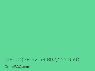 CIELCh 78.62,53.802,155.959 Color is a light green color and the nearest color is Medium Aquamarine #66ddaa. Hex code #5ed998 and RGB value is rgb(94,217,152). In RGB color space, this color is composed of 37% red, 85% green, 60% blue, In CMYK color space, this color is composed of 57% cyan, 0% magenta, 30% yellow , 15% black , In HSL color space, this color has a hue angle of 148° , 62% saturation and 61% lightness.