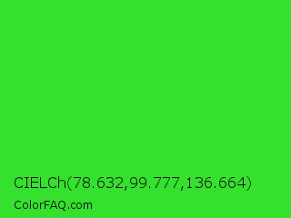 CIELCh 78.632,99.777,136.664 Color is a normal green color and the nearest color is Lime Green #32cd32. Hex code #36e02e and RGB value is rgb(54,224,46). In RGB color space, this color is composed of 21% red, 88% green, 18% blue, In CMYK color space, this color is composed of 76% cyan, 0% magenta, 79% yellow , 12% black , In HSL color space, this color has a hue angle of 117° , 74% saturation and 53% lightness.