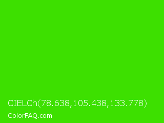CIELCh 78.638,105.438,133.778 Color is a normal green color and the nearest color is Harlequin #3fff00. Hex code #3de000 and RGB value is rgb(61,224,0). In RGB color space, this color is composed of 24% red, 88% green, 0% blue, In CMYK color space, this color is composed of 73% cyan, 0% magenta, 100% yellow , 12% black , In HSL color space, this color has a hue angle of 104° , 100% saturation and 44% lightness.