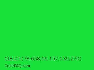 CIELCh 78.658,99.157,139.279 Color is a normal green color and the nearest color is Malachite #0bda51. Hex code #17e13a and RGB value is rgb(23,225,58). In RGB color space, this color is composed of 9% red, 88% green, 23% blue, In CMYK color space, this color is composed of 90% cyan, 0% magenta, 74% yellow , 12% black , In HSL color space, this color has a hue angle of 130° , 81% saturation and 49% lightness.