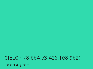 CIELCh 78.664,53.425,168.962 Color is a normal cyan color and the nearest color is Eucalyptus #44d7a8. Hex code #30dbae and RGB value is rgb(48,219,174). In RGB color space, this color is composed of 19% red, 86% green, 68% blue, In CMYK color space, this color is composed of 78% cyan, 0% magenta, 21% yellow , 14% black , In HSL color space, this color has a hue angle of 164° , 70% saturation and 52% lightness.