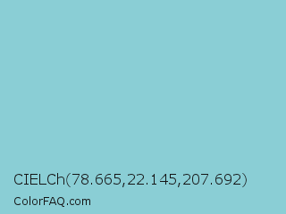 CIELCh 78.665,22.145,207.692 Color is a light cyan color and the nearest color is Half Baked #85c4cc. Hex code #8aced5 and RGB value is rgb(138,206,213). In RGB color space, this color is composed of 54% red, 81% green, 84% blue, In CMYK color space, this color is composed of 35% cyan, 3% magenta, 0% yellow , 16% black , In HSL color space, this color has a hue angle of 186° , 47% saturation and 69% lightness.