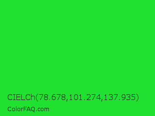 CIELCh 78.678,101.274,137.935 Color is a normal green color and the nearest color is Lime Green #32cd32. Hex code #20e130 and RGB value is rgb(32,225,48). In RGB color space, this color is composed of 13% red, 88% green, 19% blue, In CMYK color space, this color is composed of 86% cyan, 0% magenta, 79% yellow , 12% black , In HSL color space, this color has a hue angle of 125° , 76% saturation and 50% lightness.
