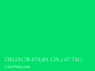 CIELCh 78.679,83.129,147.741 Color is a normal green color and the nearest color is Malachite #0bda51. Hex code #00e06b and RGB value is rgb(0,224,107). In RGB color space, this color is composed of 0% red, 88% green, 42% blue, In CMYK color space, this color is composed of 100% cyan, 0% magenta, 52% yellow , 12% black , In HSL color space, this color has a hue angle of 149° , 100% saturation and 44% lightness.