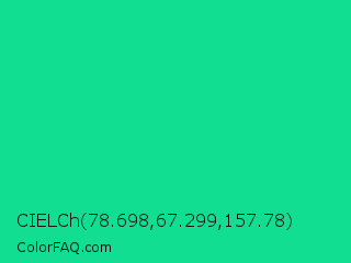 CIELCh 78.698,67.299,157.78 Color is a normal green color and the nearest color is Caribbean Green #00cc99. Hex code #11de91 and RGB value is rgb(17,222,145). In RGB color space, this color is composed of 7% red, 87% green, 57% blue, In CMYK color space, this color is composed of 92% cyan, 0% magenta, 35% yellow , 13% black , In HSL color space, this color has a hue angle of 157° , 86% saturation and 47% lightness.