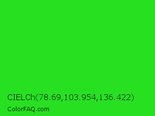 CIELCh 78.69,103.954,136.422 Color is a normal green color and the nearest color is Lime Green #32cd32. Hex code #27e121 and RGB value is rgb(39,225,33). In RGB color space, this color is composed of 15% red, 88% green, 13% blue, In CMYK color space, this color is composed of 83% cyan, 0% magenta, 85% yellow , 12% black , In HSL color space, this color has a hue angle of 118° , 76% saturation and 51% lightness.