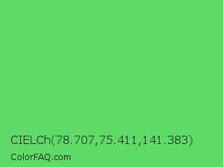 CIELCh 78.707,75.411,141.383 Color is a light green color and the nearest color is Emerald #50c878. Hex code #5cdc66 and RGB value is rgb(92,220,102). In RGB color space, this color is composed of 36% red, 86% green, 40% blue, In CMYK color space, this color is composed of 58% cyan, 0% magenta, 54% yellow , 14% black , In HSL color space, this color has a hue angle of 125° , 65% saturation and 61% lightness.