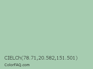 CIELCh 78.71,20.582,151.501 Color is a light green color and the nearest color is Spring Rain #accbb1. Hex code #a6ccb0 and RGB value is rgb(166,204,176). In RGB color space, this color is composed of 65% red, 80% green, 69% blue, In CMYK color space, this color is composed of 19% cyan, 0% magenta, 14% yellow , 20% black , In HSL color space, this color has a hue angle of 136° , 27% saturation and 73% lightness.
