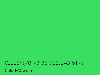 CIELCh 78.73,83.712,143.617 Color is a normal green color and the nearest color is UFO Green #3cd070. Hex code #38df60 and RGB value is rgb(56,223,96). In RGB color space, this color is composed of 22% red, 87% green, 38% blue, In CMYK color space, this color is composed of 75% cyan, 0% magenta, 57% yellow , 13% black , In HSL color space, this color has a hue angle of 134° , 72% saturation and 55% lightness.