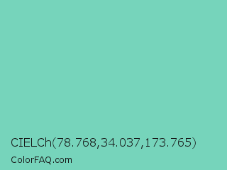 CIELCh 78.768,34.037,173.765 Color is a light cyan color and the nearest color is Downy #6fd0c5. Hex code #76d4bb and RGB value is rgb(118,212,187). In RGB color space, this color is composed of 46% red, 83% green, 73% blue, In CMYK color space, this color is composed of 44% cyan, 0% magenta, 12% yellow , 17% black , In HSL color space, this color has a hue angle of 164° , 52% saturation and 65% lightness.