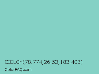CIELCh 78.774,26.53,183.403 Color is a light cyan color and the nearest color is Monte Carlo #83d0c6. Hex code #84d1c5 and RGB value is rgb(132,209,197). In RGB color space, this color is composed of 52% red, 82% green, 77% blue, In CMYK color space, this color is composed of 37% cyan, 0% magenta, 6% yellow , 18% black , In HSL color space, this color has a hue angle of 171° , 46% saturation and 67% lightness.