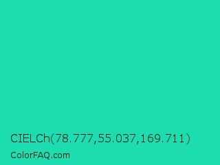 CIELCh 78.777,55.037,169.711 Color is a normal cyan color and the nearest color is Turquoise PWG #30d5c8. Hex code #1ddcaf and RGB value is rgb(29,220,175). In RGB color space, this color is composed of 11% red, 86% green, 69% blue, In CMYK color space, this color is composed of 87% cyan, 0% magenta, 20% yellow , 14% black , In HSL color space, this color has a hue angle of 166° , 77% saturation and 49% lightness.
