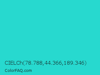 CIELCh 78.788,44.366,189.346 Color is a normal cyan color and the nearest color is Turquoise PWG #30d5c8. Hex code #27d9cf and RGB value is rgb(39,217,207). In RGB color space, this color is composed of 15% red, 85% green, 81% blue, In CMYK color space, this color is composed of 82% cyan, 0% magenta, 5% yellow , 15% black , In HSL color space, this color has a hue angle of 177° , 70% saturation and 50% lightness.