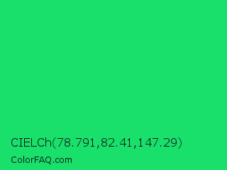 CIELCh 78.791,82.41,147.29 Color is a normal green color and the nearest color is Malachite #0bda51. Hex code #18e06b and RGB value is rgb(24,224,107). In RGB color space, this color is composed of 9% red, 88% green, 42% blue, In CMYK color space, this color is composed of 89% cyan, 0% magenta, 52% yellow , 12% black , In HSL color space, this color has a hue angle of 145° , 81% saturation and 49% lightness.