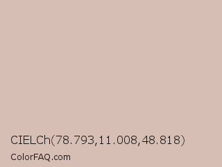 CIELCh 78.793,11.008,48.818 Color is a light orange color and the nearest color is Clam Shell #d4b6af. Hex code #d7beb4 and RGB value is rgb(215,190,180). In RGB color space, this color is composed of 84% red, 75% green, 71% blue, In CMYK color space, this color is composed of 0% cyan, 12% magenta, 16% yellow , 16% black , In HSL color space, this color has a hue angle of 17° , 30% saturation and 77% lightness.