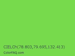 CIELCh 78.803,79.695,132.413 Color is a normal green color and the nearest color is Kiwi #8ee53f. Hex code #77da4c and RGB value is rgb(119,218,76). In RGB color space, this color is composed of 47% red, 85% green, 30% blue, In CMYK color space, this color is composed of 45% cyan, 0% magenta, 65% yellow , 15% black , In HSL color space, this color has a hue angle of 102° , 66% saturation and 58% lightness.