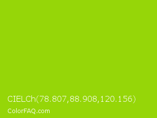 CIELCh 78.807,88.908,120.156 Color is a normal lime color and the nearest color is Sheen Green #8fd400. Hex code #96d608 and RGB value is rgb(150,214,8). In RGB color space, this color is composed of 59% red, 84% green, 3% blue, In CMYK color space, this color is composed of 30% cyan, 0% magenta, 96% yellow , 16% black , In HSL color space, this color has a hue angle of 79° , 93% saturation and 44% lightness.
