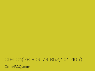 CIELCh 78.809,73.862,101.405 Color is a normal yellow color and the nearest color is Key Lime Pie #bfc921. Hex code #cec82a and RGB value is rgb(206,200,42). In RGB color space, this color is composed of 81% red, 78% green, 16% blue, In CMYK color space, this color is composed of 0% cyan, 3% magenta, 80% yellow , 19% black , In HSL color space, this color has a hue angle of 58° , 66% saturation and 49% lightness.